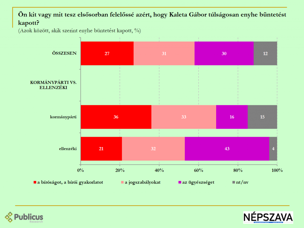 Tízből három (31 százalék) megkérdezett a jogszabályokat, tízből szintén három (30 százalék) az ügyészséget, a válaszadók negyede (27 százalék) pedig a bíróságot, a bírói gyakorlatot teszi elsősorban felelőssé azért, hogy Kaleta Gábor túlságosan enyhe büntetést kapott.