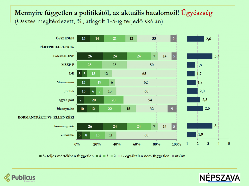 Minden negyedik (26 százalék) kormánypárti szavazó szerint az ügyészség teljes mértékben független a politikától, az aktuális hatalomtól. Közel minden hetedik (14 százalék) Fidesz szavazó szerint azonban az ügyészség a politikától egyáltalán nem független módon működik.