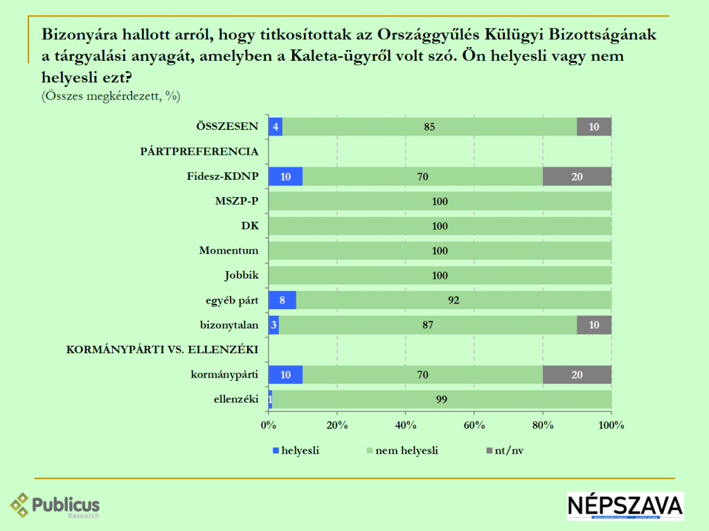 Tízből közel kilenc (85 százalék) megkérdezett nem helyesli azt, hogy titkosították az Országgyűlés Külügyi Bizottságának a tárgyalási anyagát, amelyben a Kaleta-ügyről volt szó.