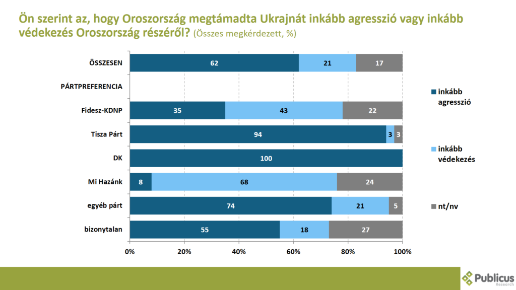 Tízből hat (62 százalék) válaszadó szerint az, hogy Oroszország megtámadta Ukrajnát, az inkább agresszió Oroszország részéről. (2022 márciusában, a háború kitörését követően 64 százaléka volt ez az arány) A mostani felmérésünk során így nyilatkozott a DK szavazók 100 százaléka, a Tisza Párt szavazóinak a 94 százaléka, a bizonytalan szavazók 55 százaléka, illetve a Fidesz szavazók 35 százaléka.