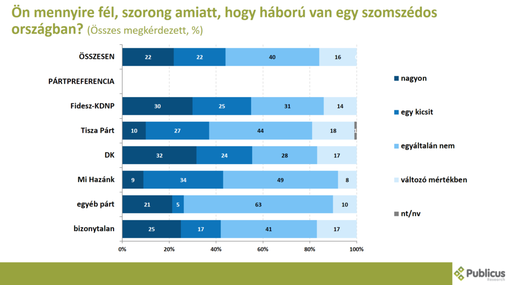 Tízből kettő (22 százalék) válaszadó mondta azt, hogy nagyon fél, szorong, szintén tízből kettő (22 százalék) pedig azt, hogy egy kicsit fél, szorong amiatt, hogy háború van egy szomszédos országban. (2022 októberében még 19, illetve 31 százalék volt ez az arány). A mostani felmérésünk során a Dk szavazók 32 százaléka, a Fidesz szavazók 30 százaléka, a bizonytalan szavazók 25 százaléka, illetve a Tisza Párt szavazóinak a 10 százaléka mondta azt, hogy nagyon fél.