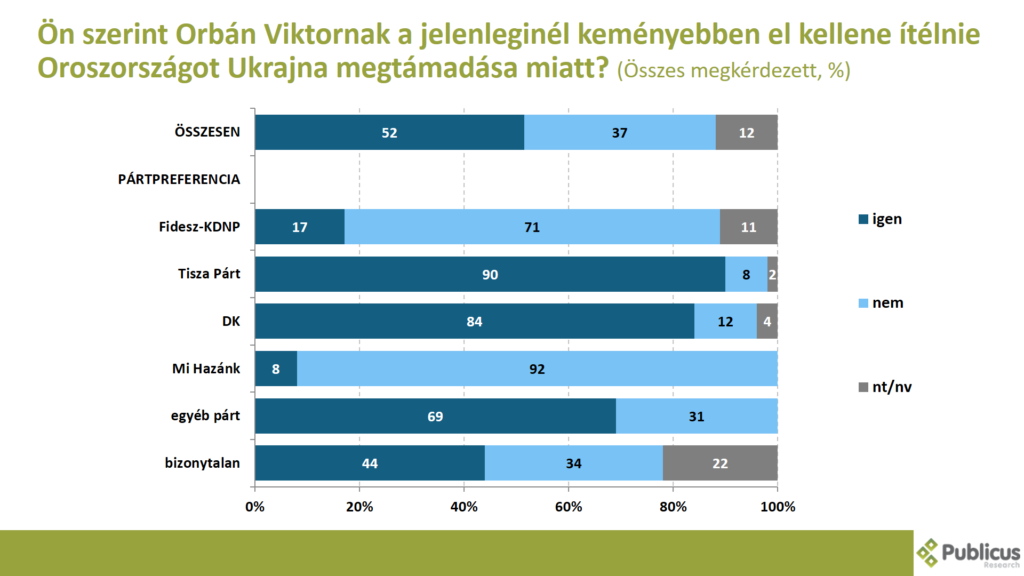 Az enyhe többség (52 százalék) szerint Orbán Viktornak a jelenleginél keményebben el kellene ítélnie Oroszországot Ukrajna megtámadása miatt. (2022 márciusában még 43 százalék volt ez az arány).
