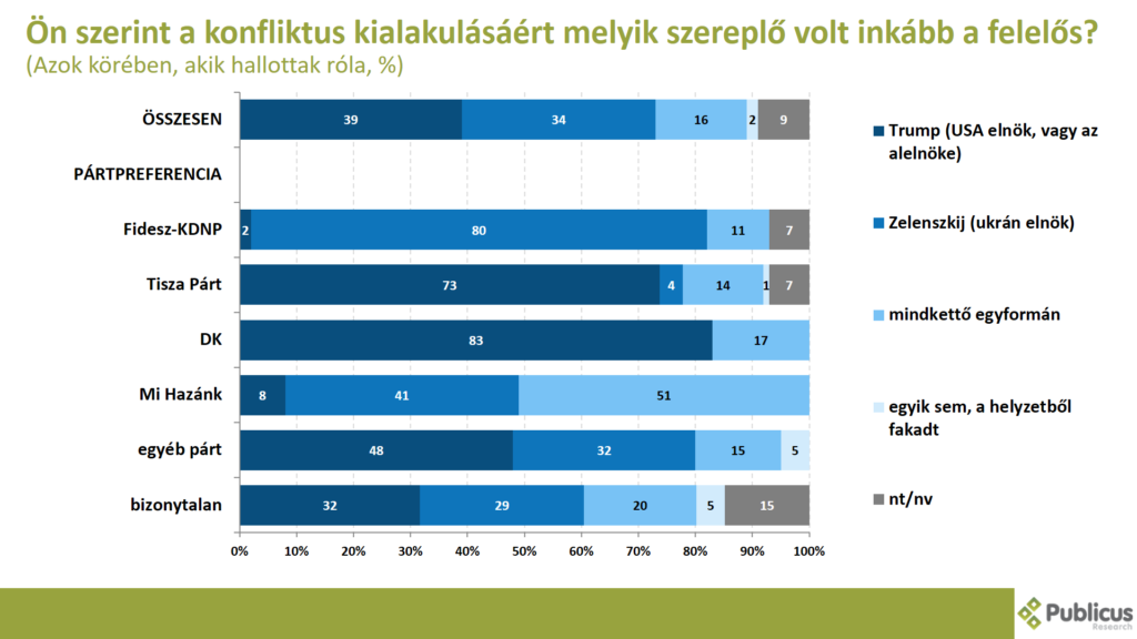 A válaszadók 95 százaléka hallott róla, hogy Donald Trump amerikai és Volodomir Zelenkszkij ukrán elnök találkozása Washingtonban veszekedésbe torkollott és nem sikerült megegyezniük a politikusoknak. Közülük tízből négyen mondták azt, hogy a konfliktus kialakulásáért inkább Trump, az Egyesült Államok elnöke, illetve J. D. Vance, az alelnök volt a felelős. Így nyilatkozott a Tisza Párt szavazóinak a 73 százaléka, a bizonytalan szavazók 32 százaléka, illetve a Fidesz szavazók 2 százaléka.