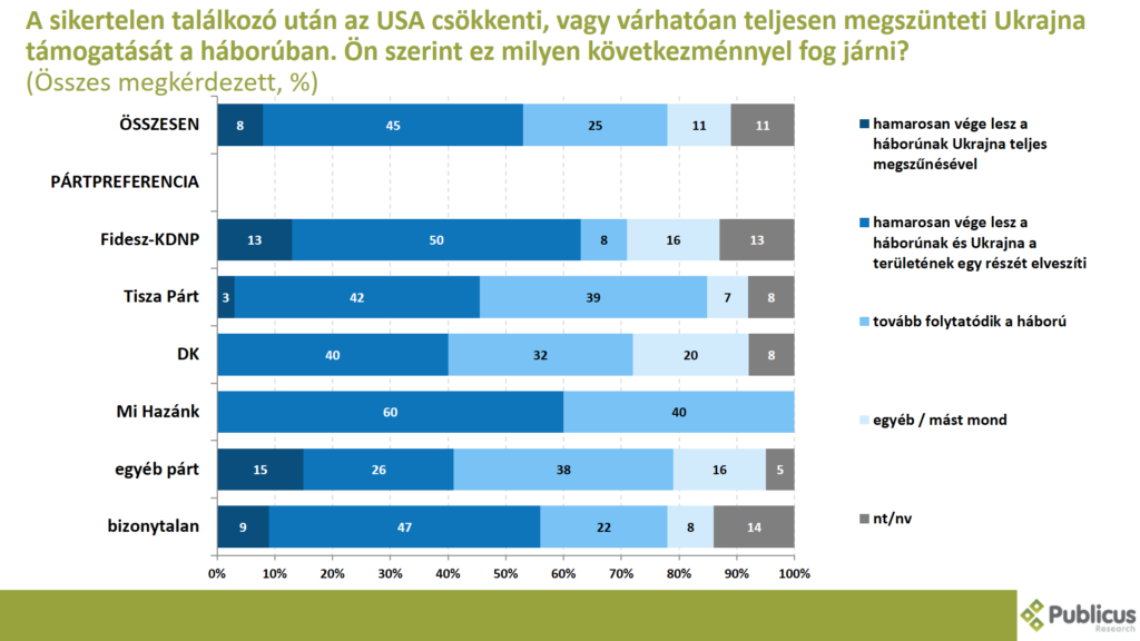 A sikertelen találkozó után az USA csökkenti, vagy várhatóan teljesen megszünteti Ukrajna támogatását a háborúban. A válaszadók közel fele szerint ez a lépés azzal fog járni, hogy hamarosan vége lesz a háborúnak és Ukrajna a területének egy részét elveszti. Így gondolja a Mi Hazánk szavazóinak a 60 százaléka, a Fidesz szavazók 50 százaléka, a bizonytalan szavazók 47 százaléka, illetve a Tisza szavazók 42 százaléka.