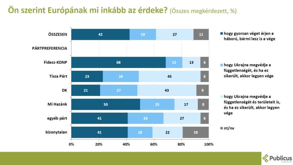 Tízből négy (42 százalék) válaszadó szerint Európának inkább az az érdeke, hogy gyorsan véget érjen a háború, bármi is lesz a vége. Így nyilatkozott a Fidesz szavazók 68 százaléka, a Mi Hazánk szavazók 50 százaléka, a bizonytalan szavazók 41 százaléka, a Tisza Párt szavazóinak 23 százaléka, illetve a DK szavazók 21 százaléka.