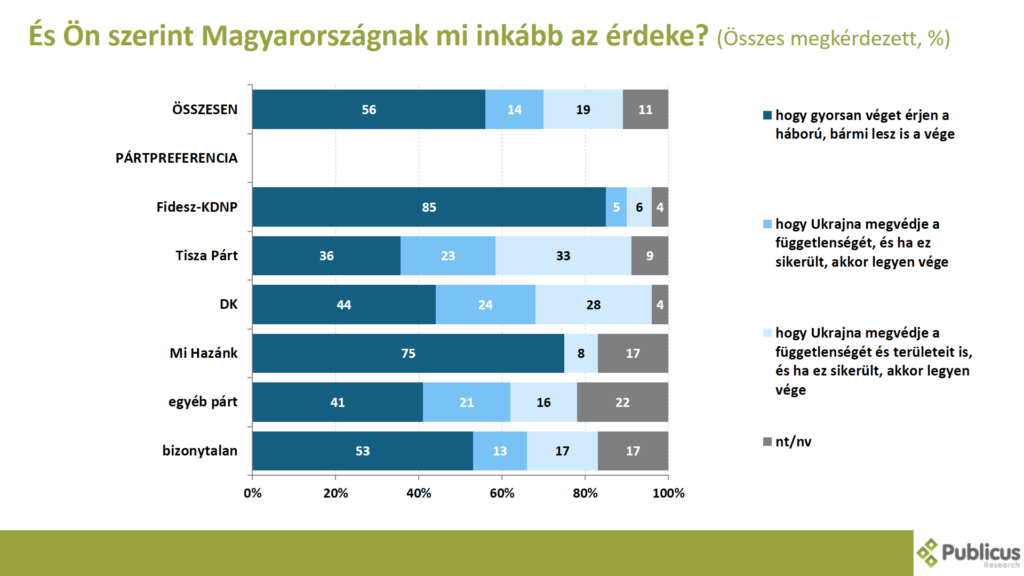 Tízből közel hat (56 százalék) válaszadó szerint Magyarországnak inkább az az érdeke, hogy gyorsan véget érjen a háború, bármi is lesz a vége. Így nyilatkozott a Fidesz szavazók 85 százaléka, a Mi Hazánk szavazók 75 százaléka, a bizonytalan szavazók 53 százaléka, a Tisza Párt szavazóinak 36 százaléka, illetve a DK szavazók 44 százaléka.