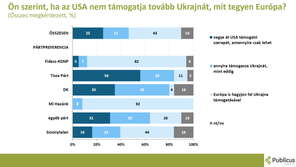 Tízből négy (43 százalék) válaszadó szerint ha az USA nem támogatja tovább Ukrajnát, akkor Európa is hagyjon fel Ukrajna támogatásával. Így nyilatkozott a Mi Hazánk szavazók 92 százaléka, a Fidesz szavazók 82 százaléka, a bizonytalan szavazók 44 százalék, illetve a Tisza Párt szavazóinak a 11 százaléka.
