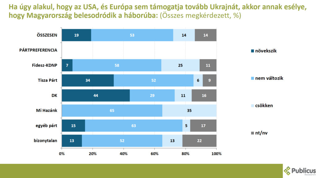 Az enyhe többség (53 százalék) szerint ha az USA, és Európa nem fogja tovább támogatni Ukrajnát, akkor sem változik annak az esélye, hogy Magyarország belesodródik-e a háborúba. Így gondolja a Fidesz szavazók 58 százaléka, a bizonytalan szavazók 52 százaléka, a Tisza Párt szavazóinak szintén 52 százaléka, illetve a DK szavazók 29 százaléka.