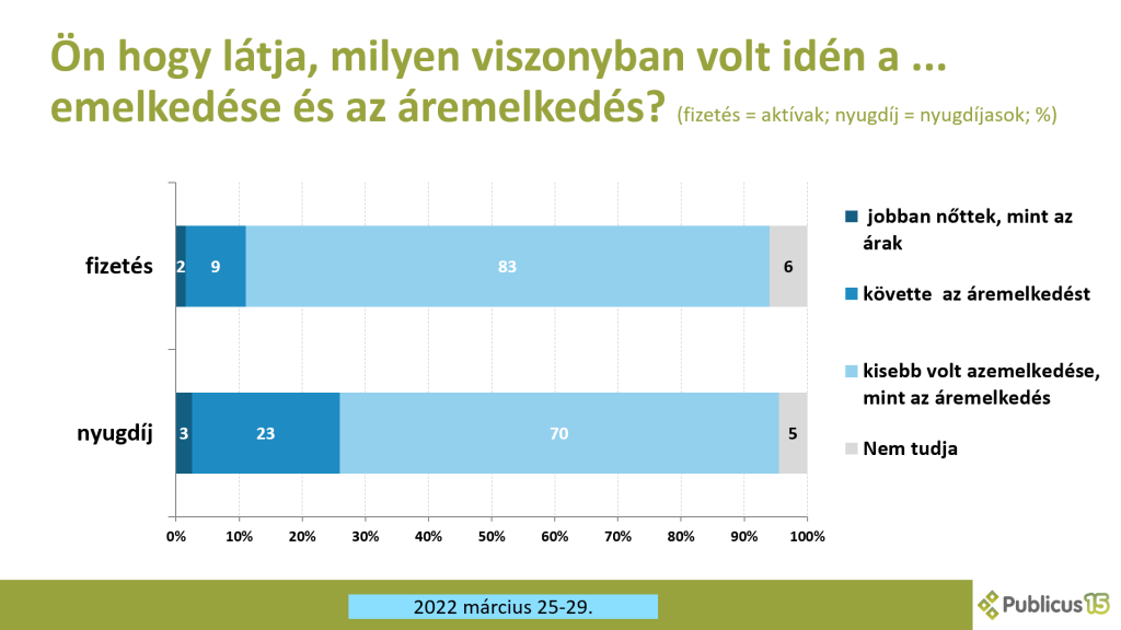 A magyar emberek úgy érzik, hogy sem a bérek, sem a nyugdíjak emelése nem kompenzálja az árak emelkedését: 83 százalék szerint a bérek növekedése kisebb mértékű volt, mint az árak növekedésének üteme. A nyugdíjak esetében ugyanezen érzet a magyarok megközelítőleg háromnegyedére (70%) jellemző. Ezek után nem meglepő, hogy a válaszadók a valóságosnál jóval magasabb, 24 százalékos inflációs rátát érzékelnek. Ennek kapcsán egy érdekes pártpolitikai törésvonal látható, a Fidesz-KDNP és az Egységben Magyarországért listájának szavazói 20-22 százalékos inflációs érzetről számolnak be, a bizonytalan pártkötődésűek viszont ennél magasabb 32 százalékos áremelkedést érzékelnek.