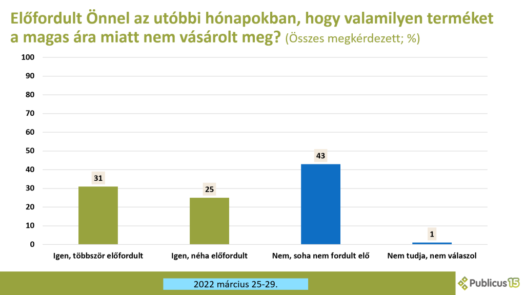 Az áremelkedés a magyarok többsége számára gondot okoz: összesen 56 százaléknyian nyilatkoztak úgy, hogy a magas árak miatt valamilyen termékről már le kellett mondaniuk az utóbbi hónapokban. A választópolgárok közel harmadának (31% százalék) ilyen nehéz döntést többször is kellett már hoznia az idei évben.