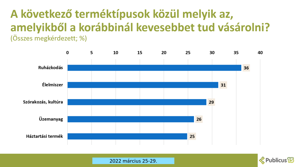 Legtöbben a ruházkodáson (36%) spórolnak, a választókorú magyarok megközelítőleg harmada (31%) bizonyos élelmiszerek megvásárlásáról is le kellett mondania az egyre növekvő árak miatt. Szórakozásról és a kultúráról 29 százaléknyian mondtak le, az üzemanyagon – a hatósági árak bevezetésének ellenére – a magyarok negyedek (26%) spórolt az utóbbi hónapok során.