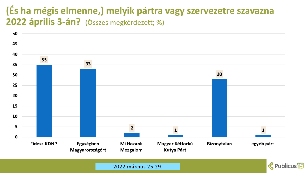 Hat ellenzéki párt (DK, Jobbik, LMP, MSZP, Momentum, Párbeszéd) a 2022-es országgyűlési választásokon szövetségben indul az „Egységben Magyarországért” névvel, így a Publicus Intézet a kampányidőszakban ezekről nem, csak a hivatalos indulókról közöl adatot.