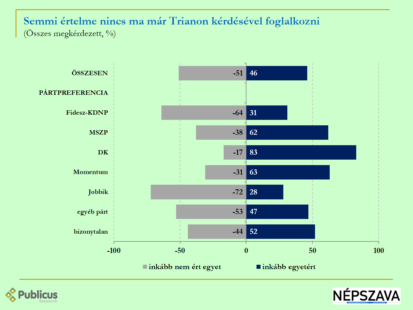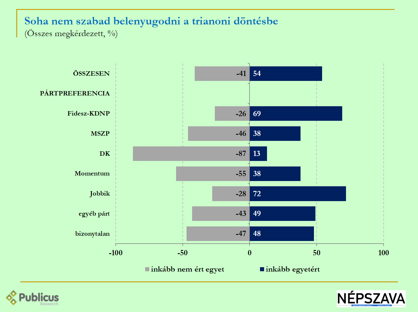 Tízből hét Fidesz és Jobbik (69 és 72 százalék) szavazó inkább egyetért azzal, hogy soha nem szabad belenyugodni a trianoni döntésbe. Tízből kilenc (87 százalék) DK, és tízből öt (55 százalék) Momentum szavazó azonban inkább ennek az ellenkezőjével ért egyet.