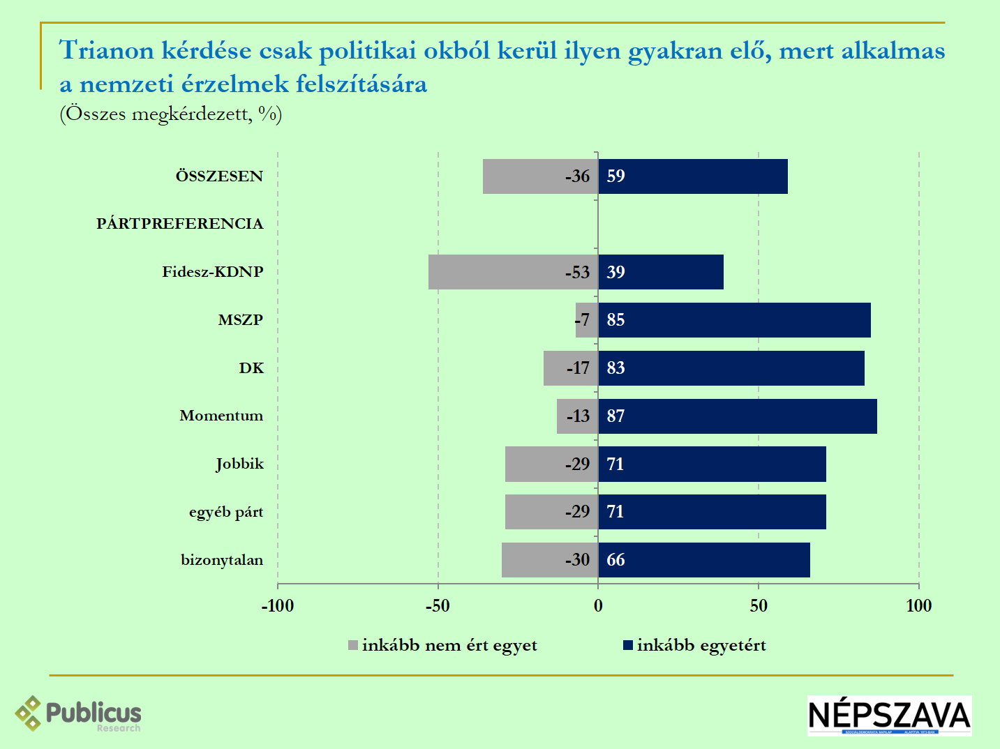 A megkérdezettek ellenzéki szavazók nagy többsége szerint Trianon kérdése csak politikai okból kerül elő ilyen gyakran, mert alkalmas a nemzeti érzelmek felszítására. A Momentum szavazók 87 százaléka, az MSZP szavazók 85 százaléka, a DK szavazók 83 százaléka, de még a Jobbik szavazók 71 százaléka is inkább egyetért ezzel az állítással. A Fidesz szavazók többsége (53 százalék) inkább nem ért egyet azzal, hogy csak politikai okokból kerül elő ilyen gyakran Trianon kérdésköre.