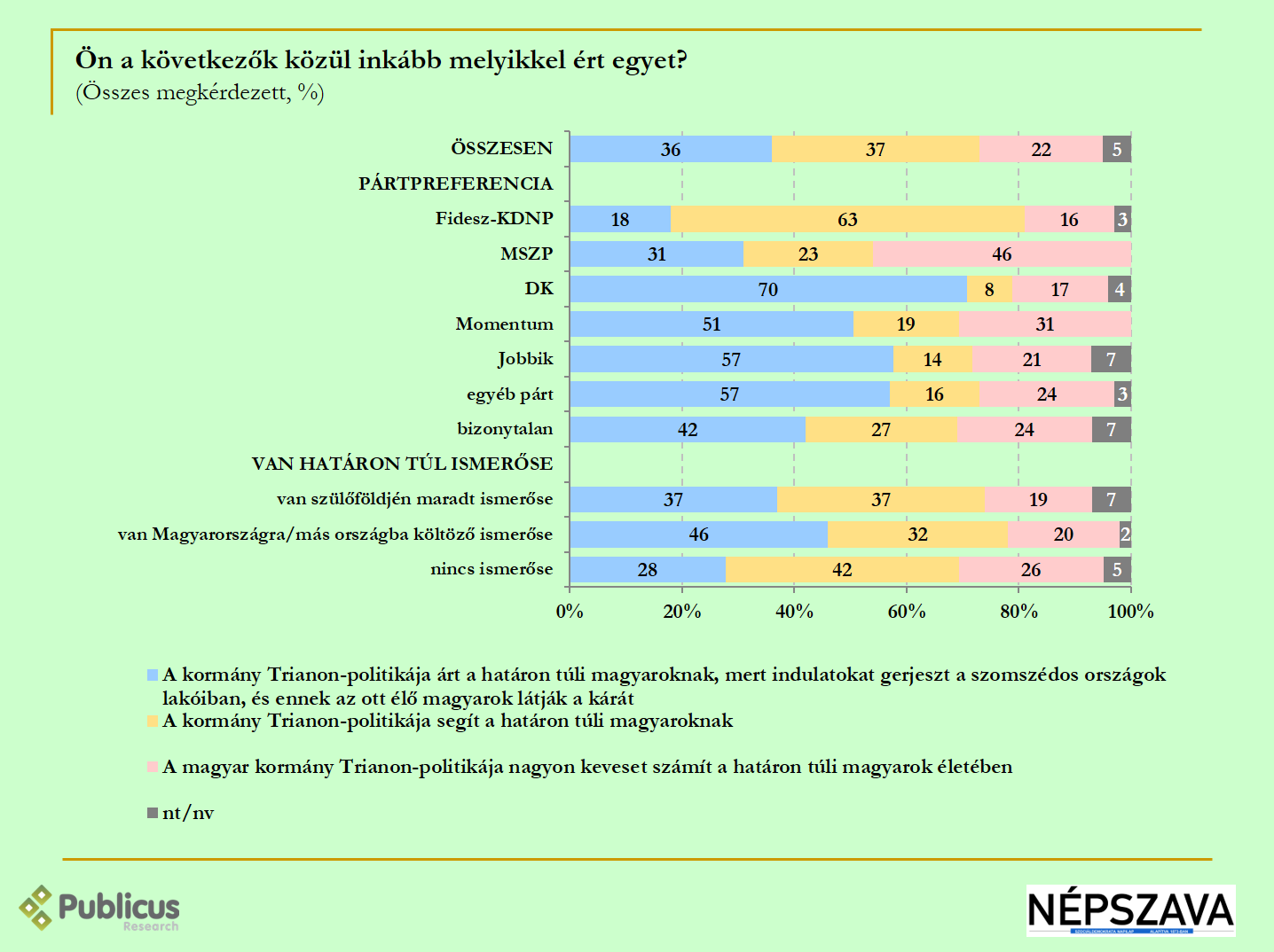 A megkérdezettek harmada (36 százalék) szerint a kormány Trianon-politikája árt a határon túli magyaroknak, mert indulatokat gerjeszt a szomszédos országok lakóiban, és ennek az ott élő magyarok látják a kárát. Közel ugyanilyen arányban (37 százalék) inkább azzal értenek egyet, hogy a kormány Trianon-politikája segít a határon túli magyarok életében. A válaszadók ötöde (22 százalék) szerint azonban a magyar kormány Trianon-politikája nagyon keveset számít a határon túli magyarok életében.