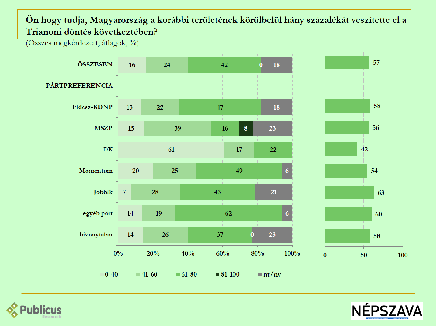 Tízből nyolc (83 százalék) DK, és tízből hat (63 százalék) Momentum szavazó inkább egyetért azzal az állítással, hogy semmi értelme nincs ma már Trianon kérdésével foglalkozni. Tízből hét (72 százalék) Jobbik, illetve tízből hat (64 százalék) Fidesz szavazó szerint Trianon kérdése még mindig aktuális.