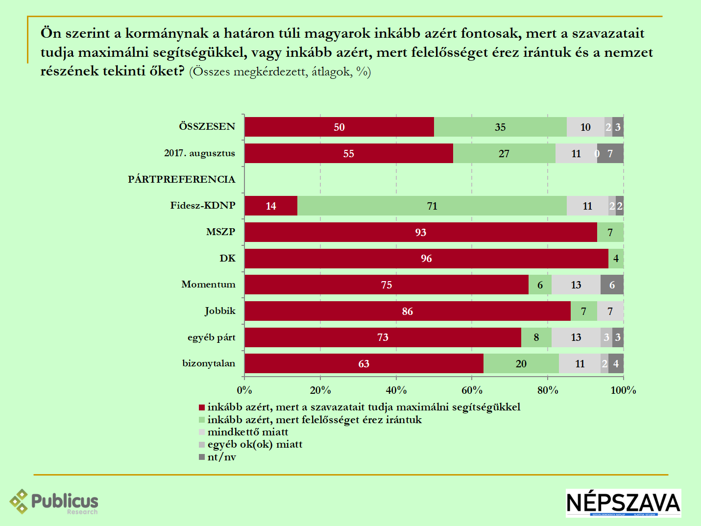 Az ellenzéki szavazók döntő többsége szerint a kormánynak azért fontosak a határon túli magyarok, mert a szavazatait maximálni tudja. Így gondolják a megkérdezett a DK szavazók 96, MSZP szavazók 93, illetve a Jobbik szavazók 86 százaléka. Tízből hét (71 százalék) Fidesz szavazó szerint azonban a kormánynak inkább azért fontosak a határon túli magyarok, mert felelősséget érez irántuk.