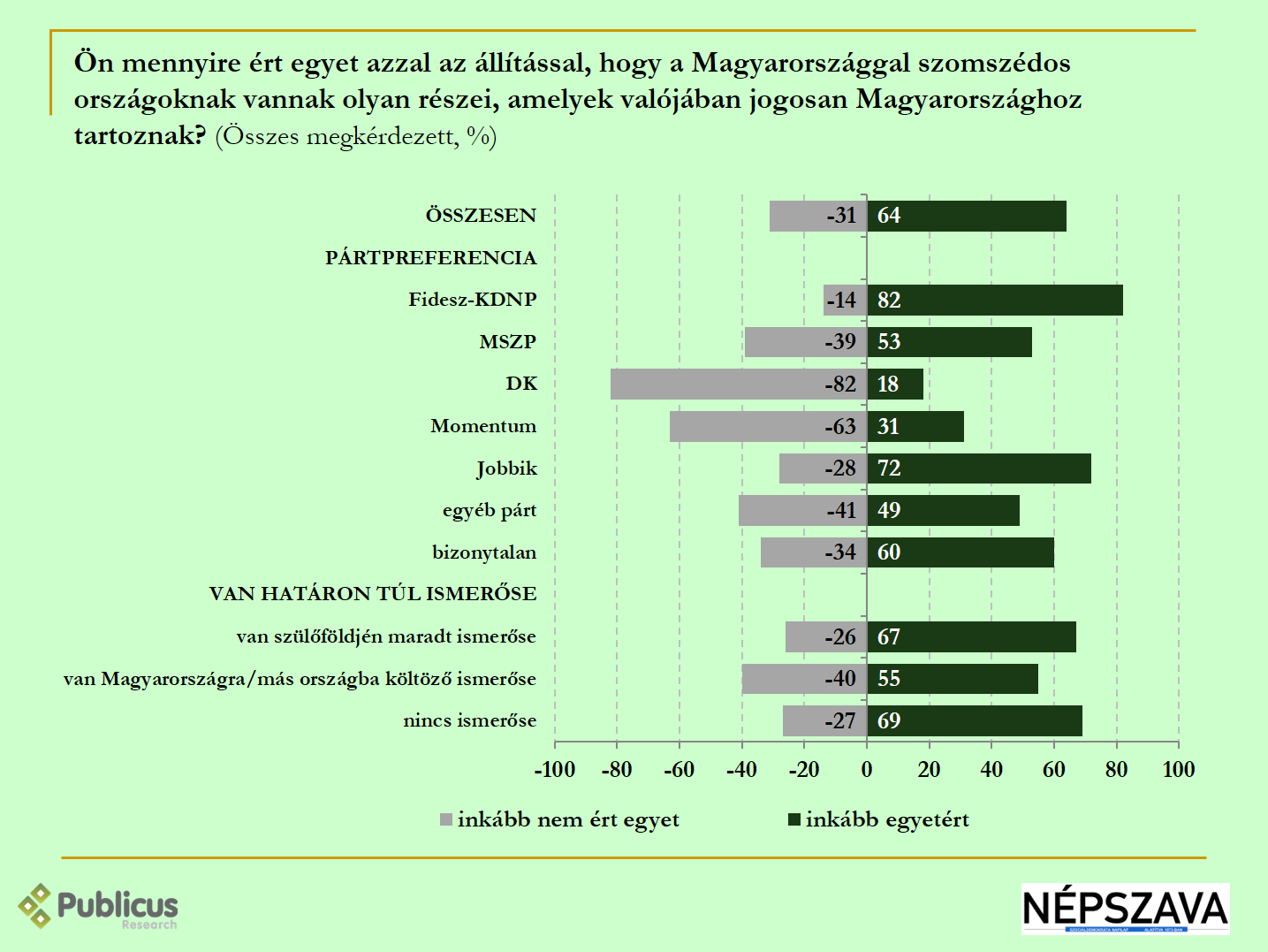 A válaszadók kétharmada (64 százalék) inkább egyetértett azzal az állítással, hogy a Magyarországgal szomszédos országoknak vannak olyan részei, amelyek valójában jogosan Magyarországhoz tartoznak. A legnagyobb arányban a Fidesz szavazók gondolják így (82 százalék), illetve az ellenzéki pártok közül még a Jobbik szavazói (72 százalék).