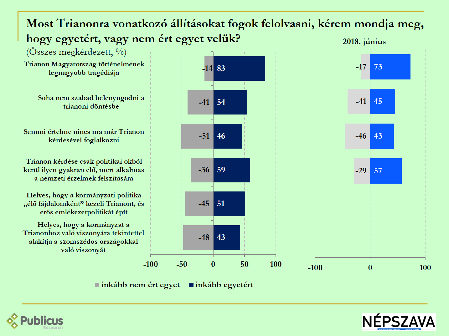 Tízből nyolc (83 százalék) megkérdezett inkább egyetért azzal, hogy Trianon Magyarország történelmének legnagyobb tragédiája. Minden második (54 százalék) válaszadó inkább egyetért azzal, hogy soha nem szabad belenyugodni a trianoni döntésbe. Minden második (51 százalék) inkább nem ért egyet azzal, hogy semmi értelme nincs ma már Trianon kérdésével foglalkozni.