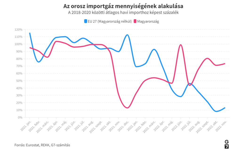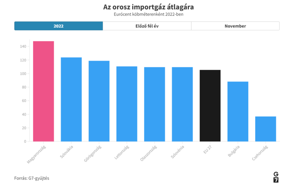 A hazai gázpiaci verseny hiánya miatt az Orbán-kormány könnyen tudott hosszú távú szerződéseket kötni Oroszországgal, amelyek, habár biztosítják a gázellátást, rugalmatlan (és válságos áremelkedés esetében kifejezetten káros) felételekkel rendelkeznek, amelyet az orosz fél bármikor használhat nyomásgyakorlásra. Ráadásul a Gazprom már a háború előtt elkezdte az ármanipulációt, ami rekord gázárakat állított elő az európai vevők számára. Ez különösen rosszul érintette hazánkat, amelynek vezetése, Szijjártó Péter közbenjárásával egy különösen előnytelen szerződést kötött. A magyar-orosz gázszerződés feltételei nem nyilvánosak, de a Népszava és a G7 számításai szerint Magyarország az orosz gázt annak két hónappal korábbi tőzsdei árán vásárolja a Gazpromtól. Ez már önmagában is csökkenti az importőr mozgásterét, azonban önmagában még nem jelent komoly problémát. Azonban, ahogy a G7 is írja, Magyarország többször is épp akkor vásárolta a legnagyobb mennyiségű orosz gázt, amikor az a legdrágább volt – szembe menve az Európai trendekkel.