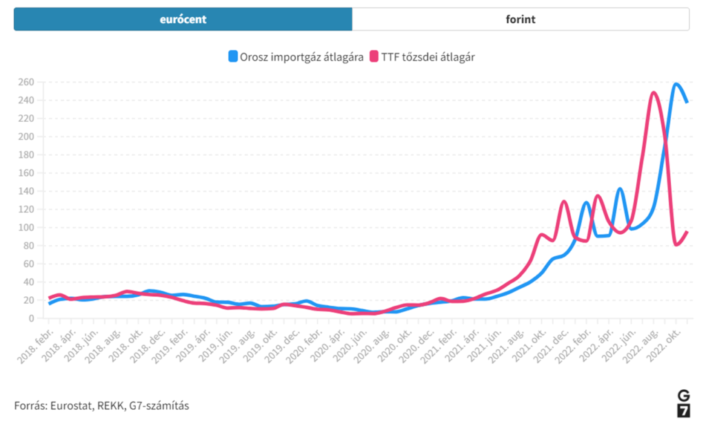 Az energiaárak természetesen nem csak Magyarországon szöktek az egekbe. Lényeges különbség azonban, hogy amíg agáz piaci ára a gázimport diverzifikálása miatt egy idő után normalizálódott Európában, addig Magyarország a mai napig az egyik legrosszabb árfolyamon veszi az orosz gázt.