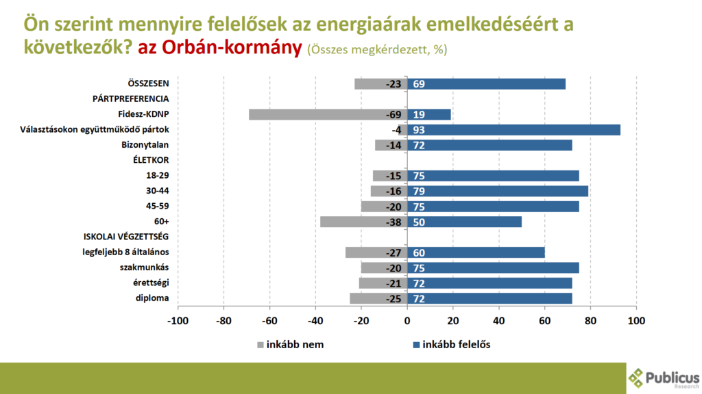 Másodszor, a társadalom többsége felelősnek tartja a Fideszt az a kialakult helyzetért. Januárban a válaszadók 45 százaléka tartotta felelősnek a „brüsszeli szankciókat” az energiaárak emelkedéséért, amíg ugyanezért 59 százalékuk hibáztatta Oroszországot, azonban a legmagasabb arányban (69%) az Orbán-kormányt tették felelőssé az emberek. Ráadásul az utóbbi csoportba beletartozik nemcsak szinte minden ellenzéki szavazó (93%), hanem a bizonytalan szavazók majd’ háromnegyede (72%), és a Fidesz szavazók 20 százaléka is. Emellett a kormány energiapolitikájának részletei is hasonlóan népszerűtlenek: azt, hogy az energiaárak nem követik a tőzsdei árfolyamokat, csupán az emberek 33 százaléka támogatja (52% ellenében), amíg a döntő többség (68%, 19% ellenében) szerint a Fidesznek lenne mozgástere csökkenteni a lakossági energiaárakat. Ennek tekintetében tehát nem meglepő, hogy a társadalom 72 százaléka elégedetlen azzal, ahogy az országban jelenleg mennek a dolgok. Jogos azonban a kérdés: miben nyilvánul meg akkor ez az elégedetlenség?