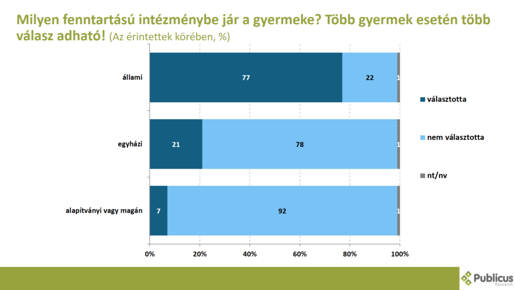 A megkérdezettek háromnegyede (77 százalék) mondta azt, hogy állami, minden ötödik (21 százalék) hogy egyházi, 7 százaléka pedig azt, hogy vagy alapítványi, vagy pedig magán iskolába jár gyermeke.