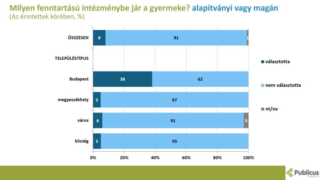 Leginkább a Budapesten élők mondták azt, hogy gyermekük vagy alapítványi, vagy pedig magániskolába jár. (38 százalék)