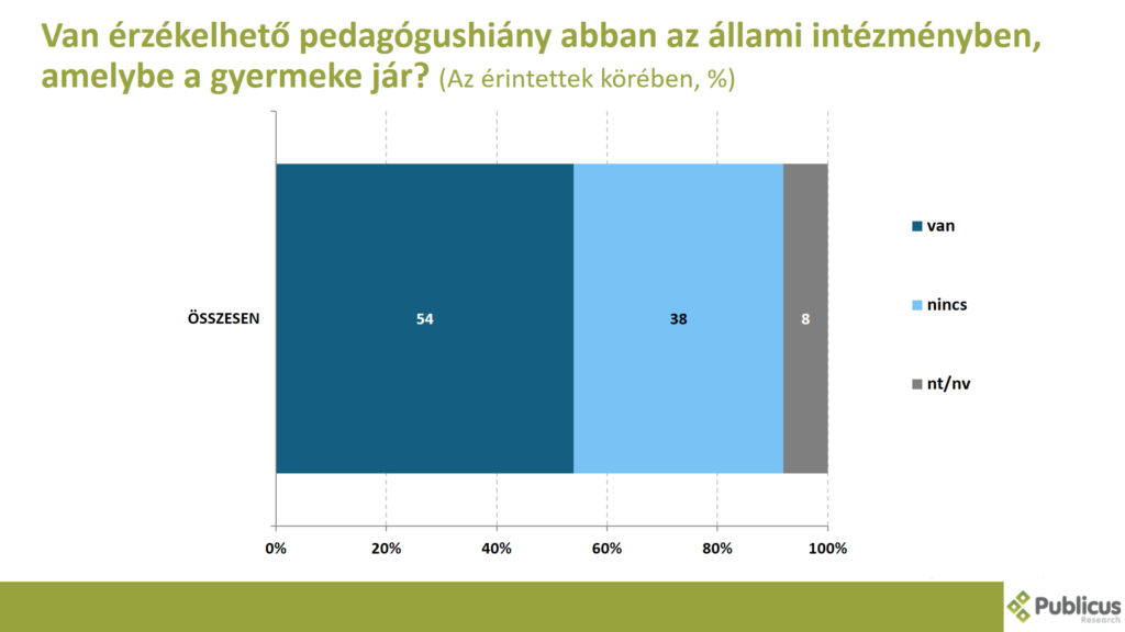 A megkérdezettek többsége (54 százalék) azt mondta, hogy van érzékelhető pedagógushiány abban az állami intézményben, amelybe a gyermeke jár. Tízből négy (38 százalék) válaszadó szerint nincs erről szó, további 8 százalék nem tudott, vagy nem akart válaszolni a kérdésre.