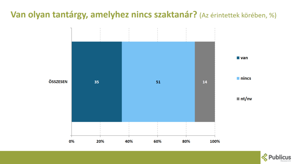 A válaszadók harmada (35 százaléka) nyilatkozott úgy, hogy van olyan tantárgy, amelyhez nincs szaktanár. Minden második (51 százalék) megkérdezett szerint nincsen ilyen tantárgy, illetve 14 százalék nem tudott, vagy nem akart válaszolni erre a kérdésre.