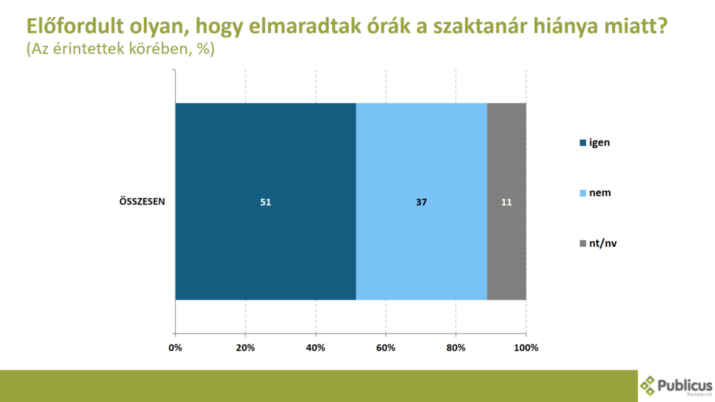 Minden második (51 százalék) megkérdezett mondta azt, hogy elmaradtak órák a szaktanár hiánya miatt. Tízből közel négyen (37 százalék) nem számoltak be ilyenről, 11 százalék nem tudott, vagy nem akart válaszolni erre a kérdésre.