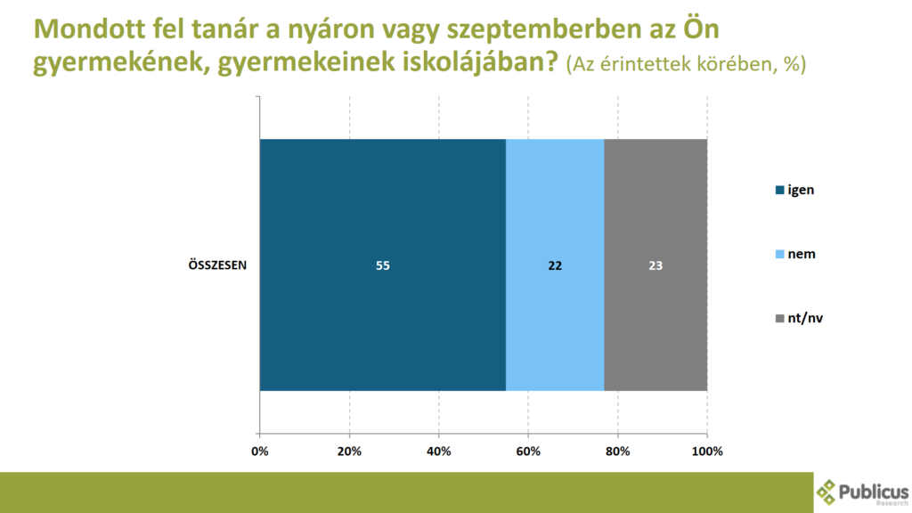 A válaszadók többsége (55 százalék) közölte azt, hogy mondott fel tanár a nyáron vagy szeptemberben gyermekének, gyermekeinek iskolájában. A megkérdezett közel negyede (22 százalék) nem mondta ezt, 23 százalék nem tudott, vagy nem akart válaszolni erre a kérdésre.
