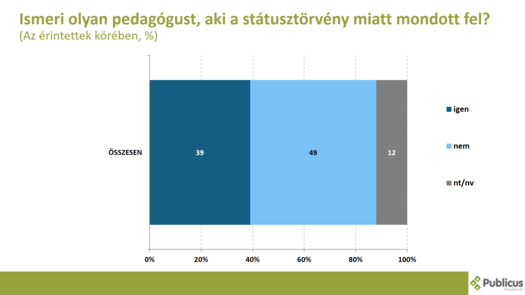 Tízből négy (39 százalék) válaszadó ismer olyan pedagógust, aki a státusztörvény miatt mondott fel. Minden második válaszadó nem ismer ilyen pedagógust, illetve 12 százalék nem tudott, vagy nem akart válaszolni erre a kérdésre.
