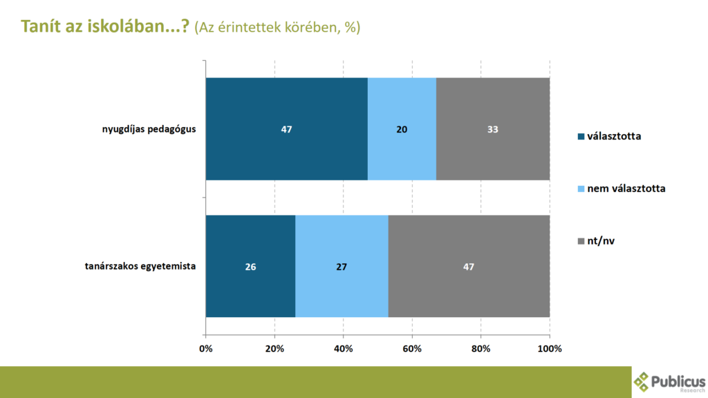 Közel minden második (47 százalék) válaszadó mondta azt, hogy tanít az iskolában nyugdíjas pedagógus. A megkérdezettek negyede (26 százalék) pedig arról számolt be, hogy tanít az iskolában tanárszakos egyetemista.