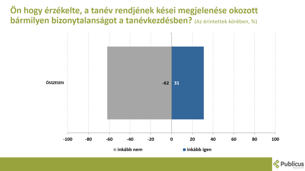 Tízből három (31 százalék) válaszadó érzékelte inkább úgy, hogy a tanév rendjének kései megjelenése okozott bizonytalanságot a tanévkezdésben.