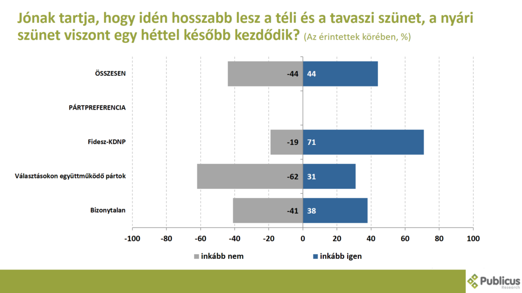 Ugyanilyen arányban (44 százalék) tarták azt inkább rossznak, hogy hosszabb lesz a téli és a tavaszi szünet a nyári szünidő rovására. Ezt közölte a választásokon együttműködő ellenzéki pártok szavazói közül tízből hat (62 százalék), tízből négy (41 százalék) bizonytalan szavazó, illetve minden ötödik (19 százalék) Fidesz szavazó.