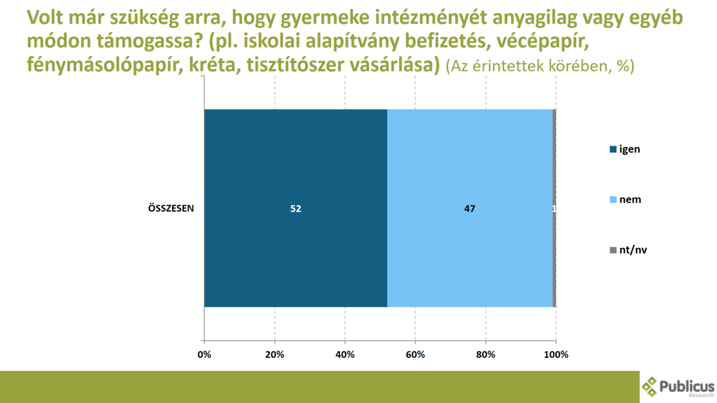 A válaszadók enyhe többsége (52 százalék) mondta azt, hogy volt már szükség arra, hogy gyermeke intézményét anyagilag vagy egyéb módon támogassa (pl. iskolai alapítvány befizetés, vécépapír, fénymásolópapír, kréta, tisztítószer vásárlása)