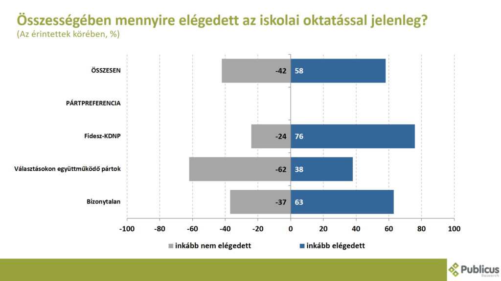 Tízből hat (58 százalék) megkérdezett összességében inkább elégedett az iskolai oktatással jelenleg. Így nyilatkozott a Fidesz szavazók háromnegyede (76 százalék), a bizonytalan szavazók közel kétharmada (63 százalék), illetve a választásokon együttműködő ellenzéki pártok szavazói közül tízből négy (38 százalék).