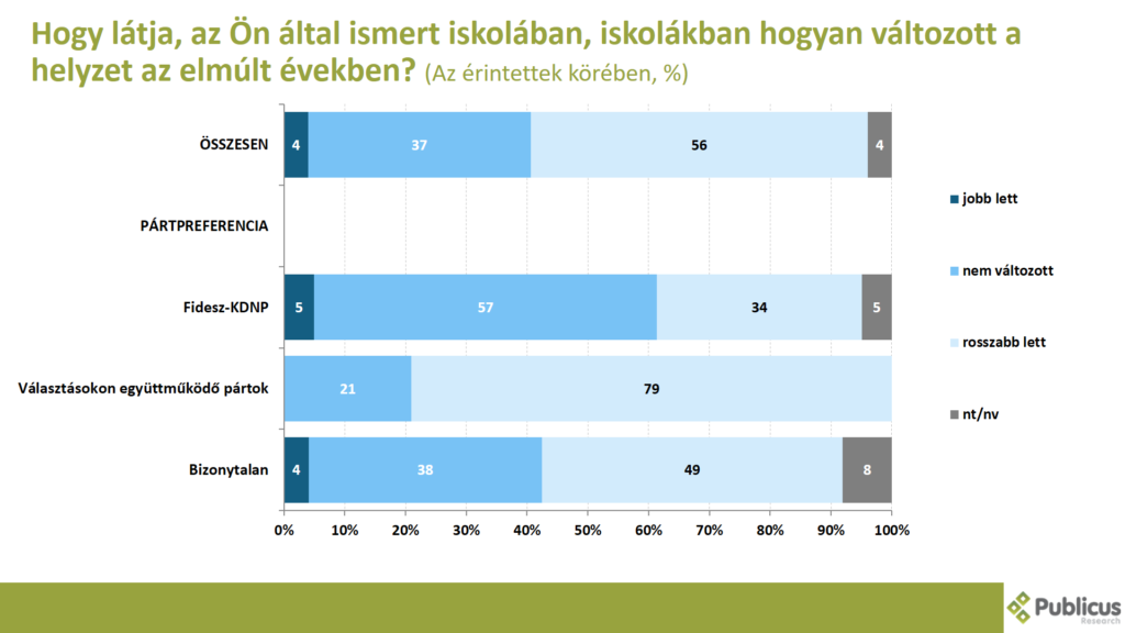 Tízből közel hat (56 százalék) válaszadó úgy látja, hogy az általa ismert iskolában, iskolákban rosszabb lett a helyzet az elmúlt . Így gondolja a választásokon együttműködő ellenzéki pártok szavazói közül tízből nyolc (79 százalék), minden második (49 százalék) bizonytalan szavazó, illetve a Fidesz szavazók harmada (34 százalék).