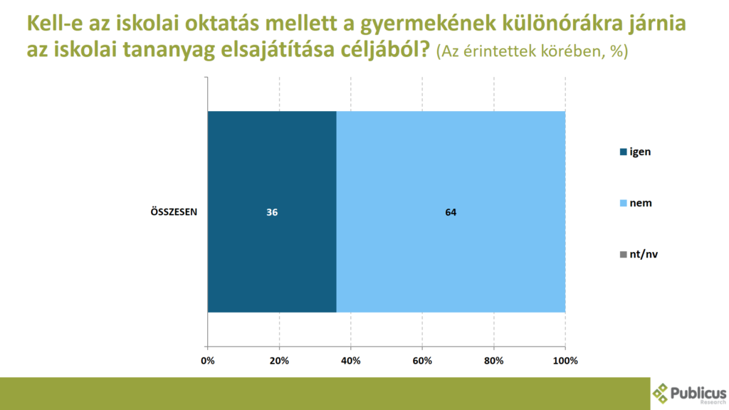 Tízből közel négy válaszadó (36 százalék) mondta azt, hogy az iskolai oktatás mellett a gyermekének különórákra kell járnia az iskolai tananyag elsajátítása céljából.