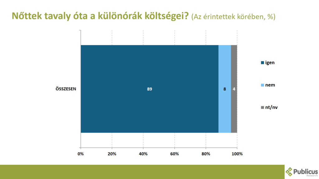 Tízből közel négy megkérdezett mondta azt, hogy az iskolai oktatás mellett a gyermekének különórákra kell járnia az iskolai tananyag elsajátítása céljából. Tízből kilenc szülő úgy nyilatkozott, hogy nőttek tavaly óta a különórák költségei.