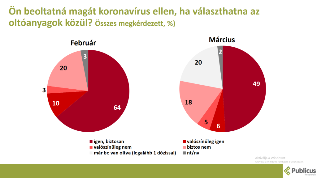 A megkérdezettek többsége beoltatná magát koronavírus ellen, ha választhatna az oltóanyagok közül. A Fidesz szavazóknál némileg alacsonyabb az oltási hajlandóság: közölük csak minden második mondta azt, hogy így tenne, ha választhat az oltóanyagok közül.