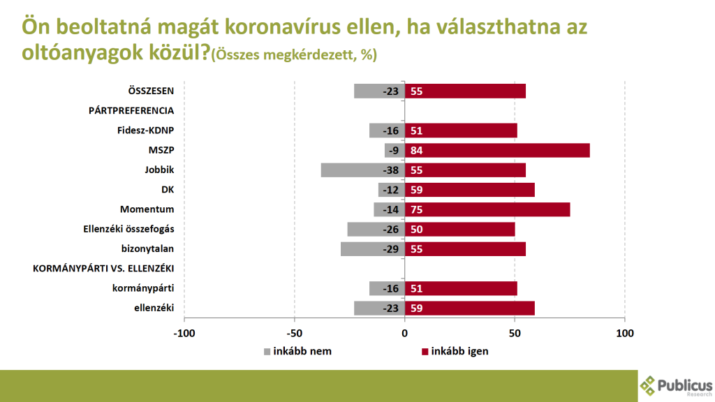 A megkérdezettek többsége (55 százalék) beoltatná magát koronavírus ellen, ha választhatna az oltóanyagok közül. Így nyilatkozott tízből hat ellenzéki (59 százalék) és szintén közel tízből hat bizonytalan szavazó is (55 százalék).