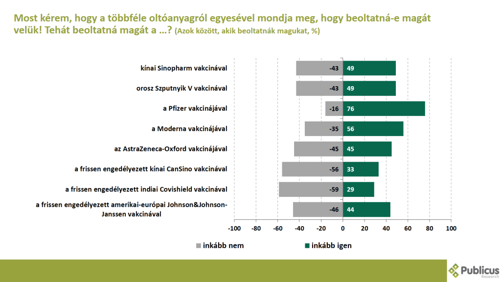 A megkérdezettek háromnegyede – azok közül, akik beoltatnák magukat – elfogadná a Pfizer vakcináját. Tízből közel hat válaszadó beoltatná magát a Moderna készítményével. Minden második megkérdezett elfogadná a kínai Sinopharm, illetve ugyanilyen arányban az orosz Szputnyik V vakcináját.