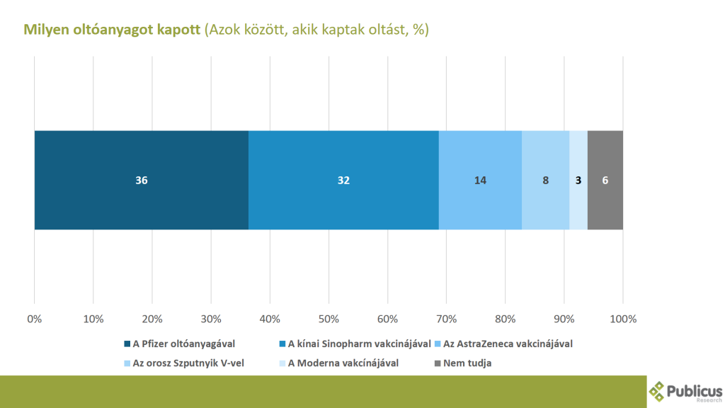 Minden hetedik (14 százalék) válaszadó az AstraZeneca vakcínáját kapta. Minden tizedik (8 százalék) megkérdezettet az orosz Szputnyik V készítménnyel oltották be. A válaszadók három százaléka Moderna vakcinát kapott.