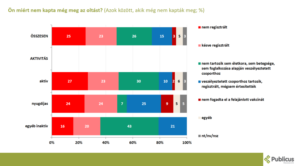 A megkérdezettek negyede (25 százalék) azért nem kapta még meg az oltást, mert még nem regisztrált. Szintén a válaszadók negyede (23 százalék) azért járhatott így, mert késve regisztrált. Ehhez hasonló arányban (26 százalék) mondták azt a megkérdezettek, hogy azért nem kaptak oltást, mert nem tartozik sem életkora, sem betegsége, sem foglalkoztatása alapján veszélyeztetett korcsoporthoz.