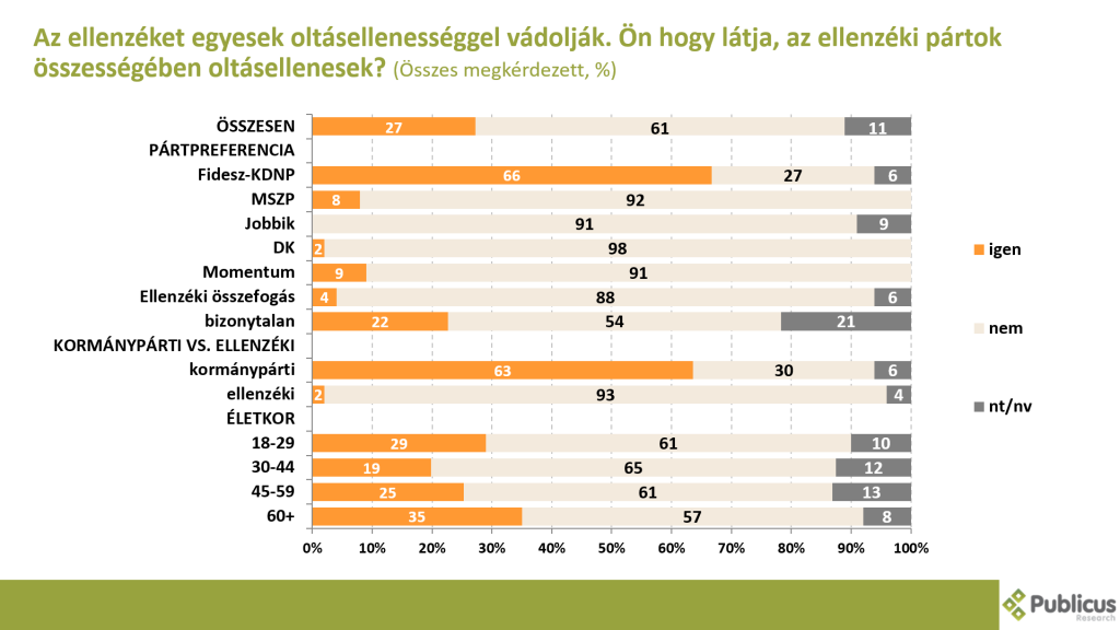 Az ellenzéki szavazók közül szinte mindenki így látja (93 százalék), míg a a bizonytalanok körében is egyértelmű többségben van ez az álláspont (54 százalék, 22 ellenében).