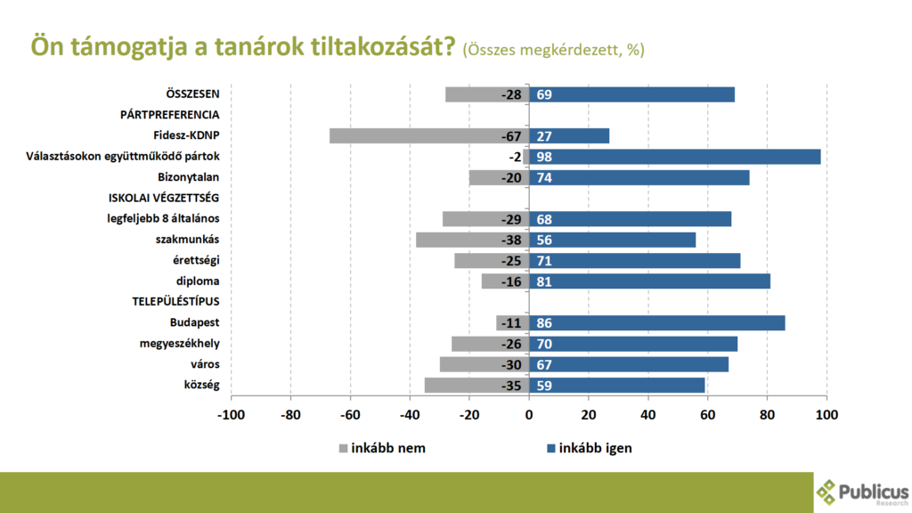 Leginkább a diplomások (81 százalék) és a Budapestiek (86 százalék) legkevésbé pedig a szakmunkások (56 százalék) és a községekben élők (59 százalék) támogatják a tanárok tiltakozását.