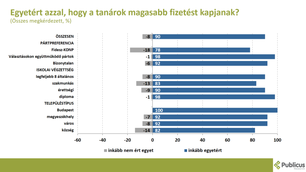 Tízből kilenc (90 százalék) megkérdezett egyetért azzal, hogy a tanárok magasabb fizetést kapjanak. Így nyilatkozott a választásokon együttműködő ellenzéki pártok szavazói közül majdnem az összes (98 százalék), tízből kilenc bizonytalan szavazó (92 százalék), illetve tízből nyolc (78 százalék) Fidesz szavazó. Itt is leginkább a diplomások és a budapestiek (98 és 100 százalék), legkevésbé pedig a községekben élők és a szakmunkások (82 és 83 százalék) támogatják a magasabb béreket, de itt is egyértelmű azért a kiugró támogatottság.