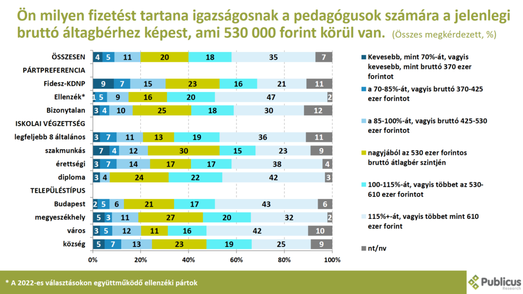A megkérdezettek harmada (35 százalék) az átlagbér több mint 115 százalékát, vagyis több mint bruttó 610 ezer forintnál többet tartana igazságosnak a pedagógusoknak. Így gondolja a választásokon együttműködő ellenzéki pártok szavazói közül minden második (47 százalék), tízből három (30 százalék) bizonytalan szavazó, illetve minden ötödik (21 százalék) bizonytalan szavazó. Továbbá ezt az összeget leginkább a diplomások (42 százalék) a budapestiek és a városokban élők (43 és 42 százalék százalék) gondolják igazságosnak.